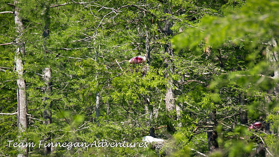 The rookery was a long way from the road. Here you can see a couple of Roseate Spoonbils and in the lower middle, a Great Egret.