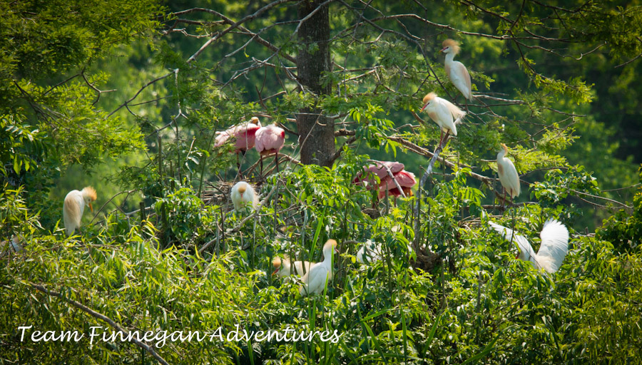 We spoke with a local also out photographing the rookery. She told us about a smaller but more accessible rookery in a near by town, named New Iberia. Although this rookery was still a long way from the road, it was easier to observe the groups of multiple species that make up a rookery. Here we have Roseate Spoonbills, Great Egrets and the Cattle Egrets with the golden breeding plumage on their heads.