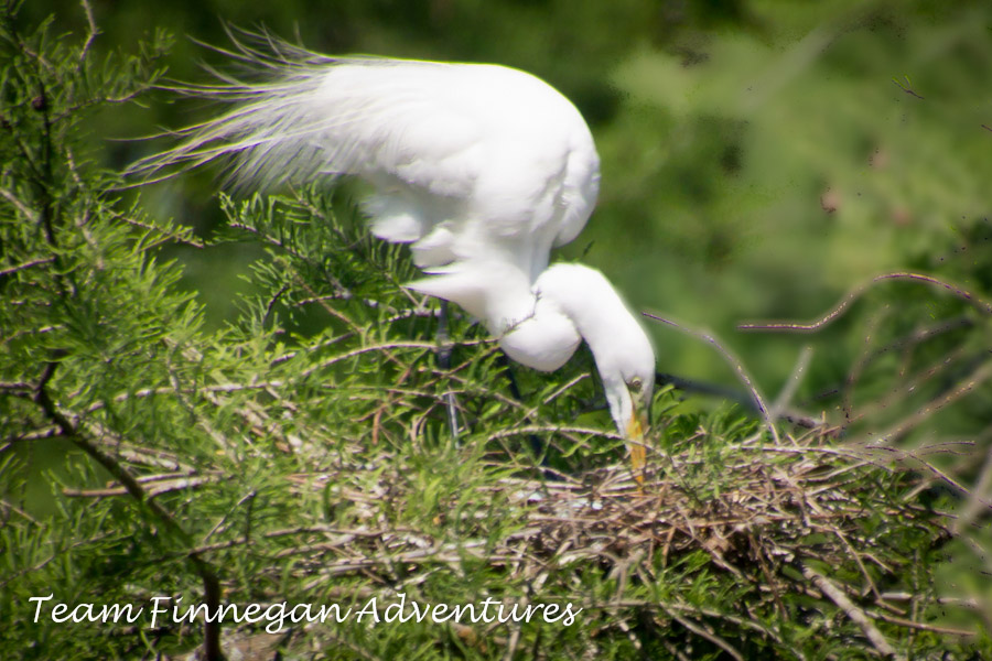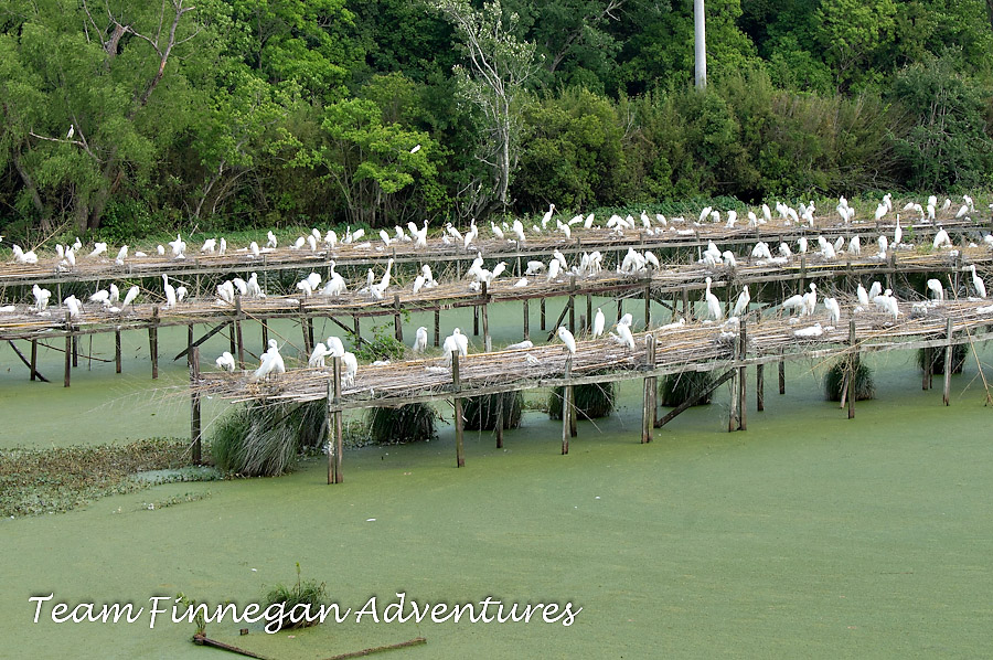 We chatted with another local in New Iberia who told us about a very unique, human-made rookery on Avery Island. Perhaps you are unfamiliar with Avery Island, but I am sure you have heard of the item produced there, Tabasco Sauce. Avery Island is quite a tourist attraction, offering tours of the Tabasco plant and drives throughout the island. In the 1890’s, during the slaughter of egrets for their breeding plumage, Mr. McIlhenny saved a small group of Snowy Egrets. This group returned every year to Avery Island with their offspring to breed. This area became known as “bird city”. To handle a growing number of returning birds, the owners of Avery Island experimented with building platforms to act as an artificial rookery. This has been a resounding success. While we were there, the platforms were filled with Great Egret families. Later in the spring, other species arrive.