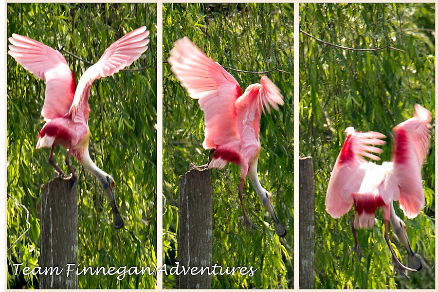 Roseate Spoonbill launching from a pole next to the rookery