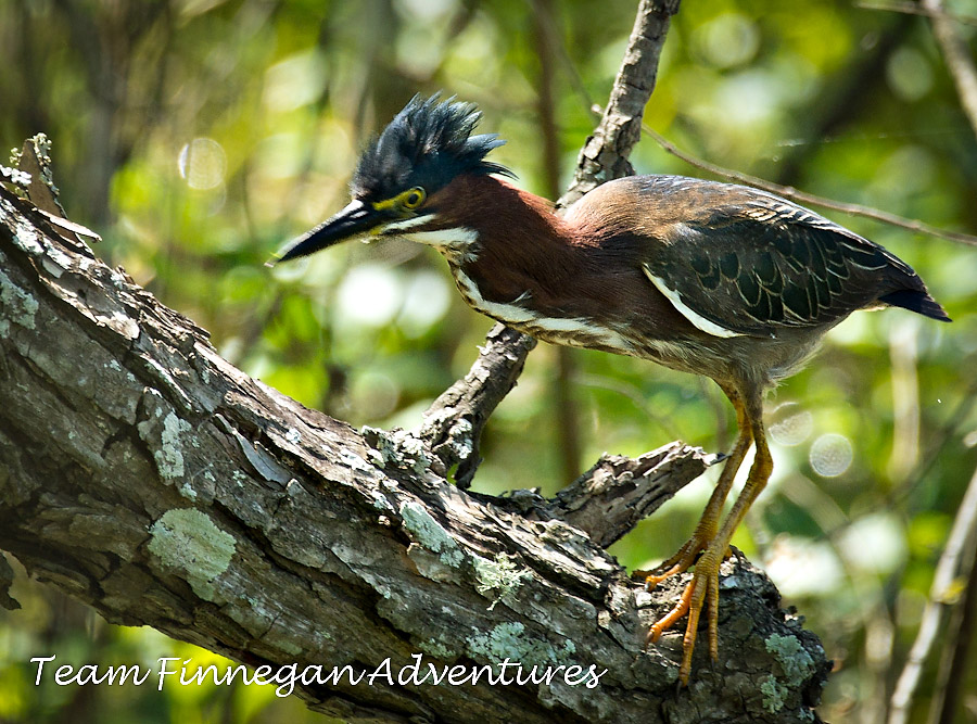 The same Green Heron, this time showing off a punk rock “do”, expands the hunting possibilities to a tree.