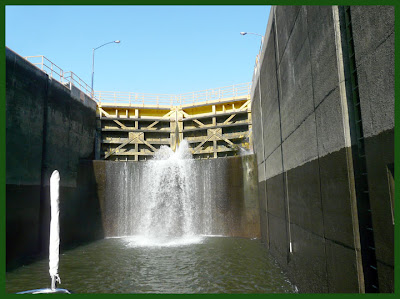 Once we are in the lock and holding the ropes, water comes into the lock if you are going up or goes out of the lock if you are going down. In this picture, we are going up, so water is coming in. The water comes in from down below. The water you see coming out of the gate is not where the water comes in. This is a leak.