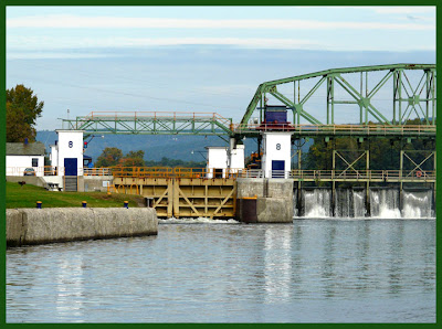 In this picture, we are heading up the Erie Canal toward a lock. On the right side is a wall where boaters can tie up for the night or to wait for a lock to open. In October, 2008, we did not have to wait for any locks. Diesel was over $5.00/gallon and people were not on the water. We only had one other boat with us in the 22 locks we traversed.