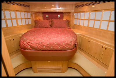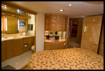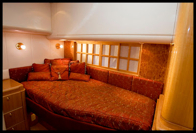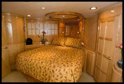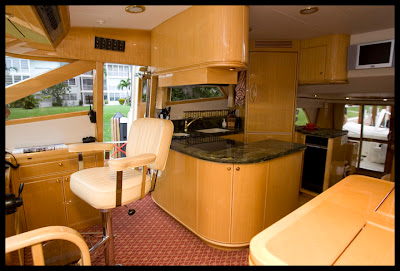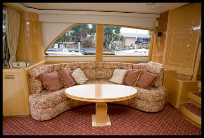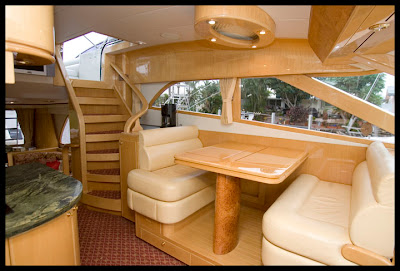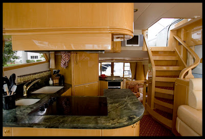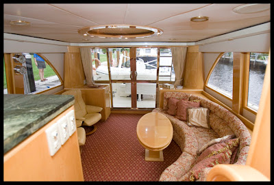 Helm station where Captain Robert drives the boat if it is cold or rainy. To the right of the helm station are the steps going down to the staterooms.