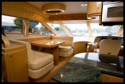 The area up the steps from the salon has three functions: galley, helm station and dinette. This picture shows the dinette, a corner of the galley with the helm station behind.