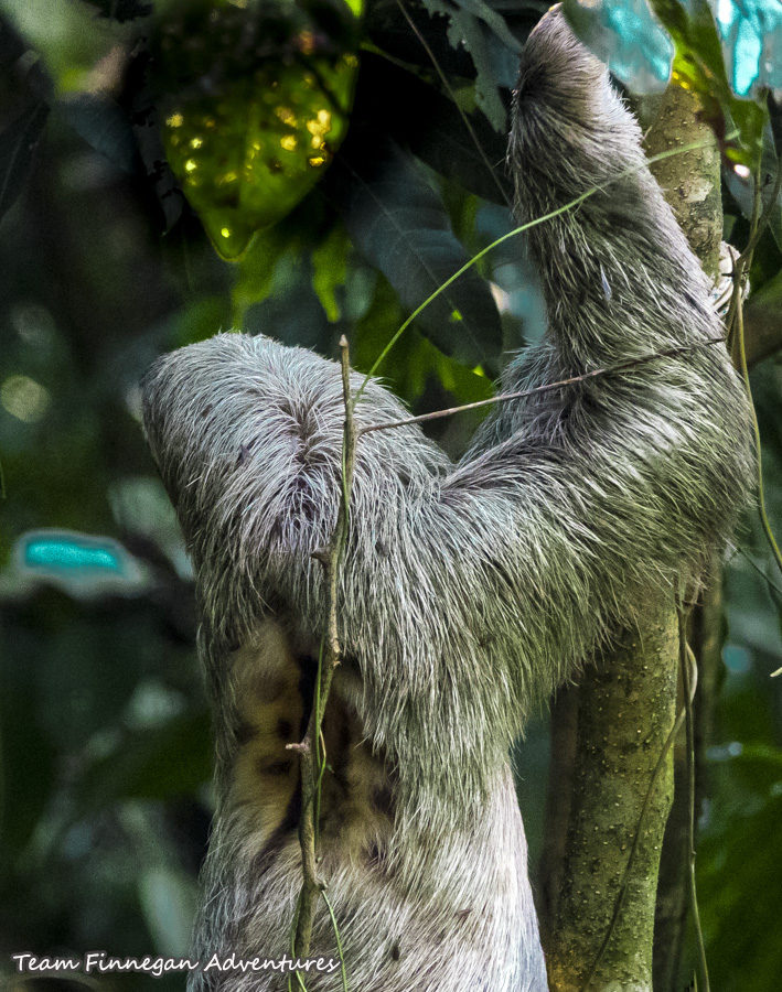 We were told this is a male sloth because of the bare area on his back. The greenish areas on his arm, head and back are the algae that grows on the fur of the sloth. I’ve heard this helps with the sloth’s camouflage in the trees. You will also see in the greenish areas some very small dark spots. These are the moths which live on the sloth and eat the algae.